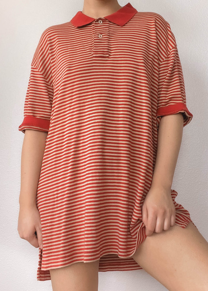 vintage late 90’s comfy red & beige striped short sleeve shirt with cream buttons