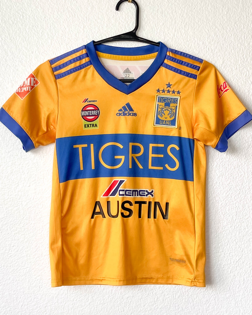 late 2000’s orange-ish yellow & blue stretchy athletic jersey tee with a v-neckline & graphics on both the front & back