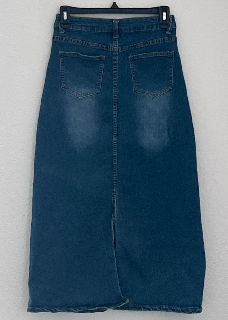 secondhand modern low-rise dark wash denim maxi skirt with front & back pockets and a zip-fly & button closure