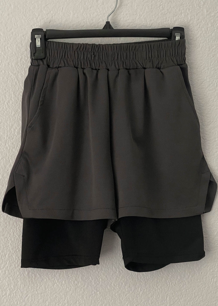 second modern charcoal gray athletic shorts with a high waisted fit, a chunky elastic waistband, pockets & black bike shorts layered & attached underneath