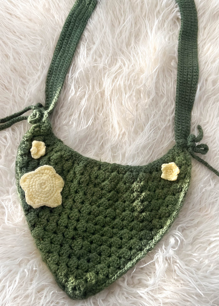 vintage 90’s dark green crochet purse with a cross-body length strap & 3 yellow flowers on the front