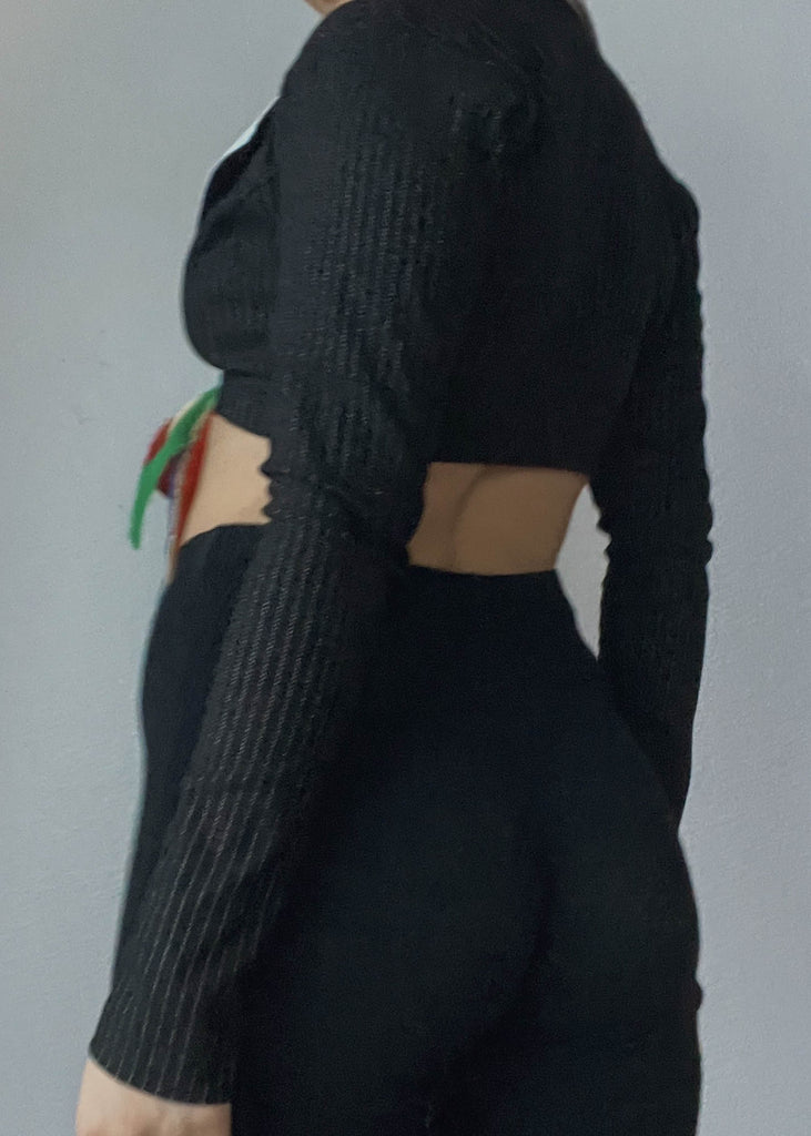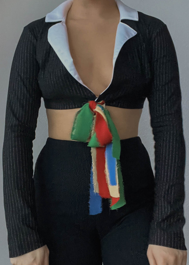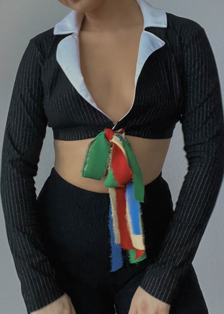 vintage 2000's black & white collared long sleeve top with a cropped fit & a rainbow ribbon tie closure in the front