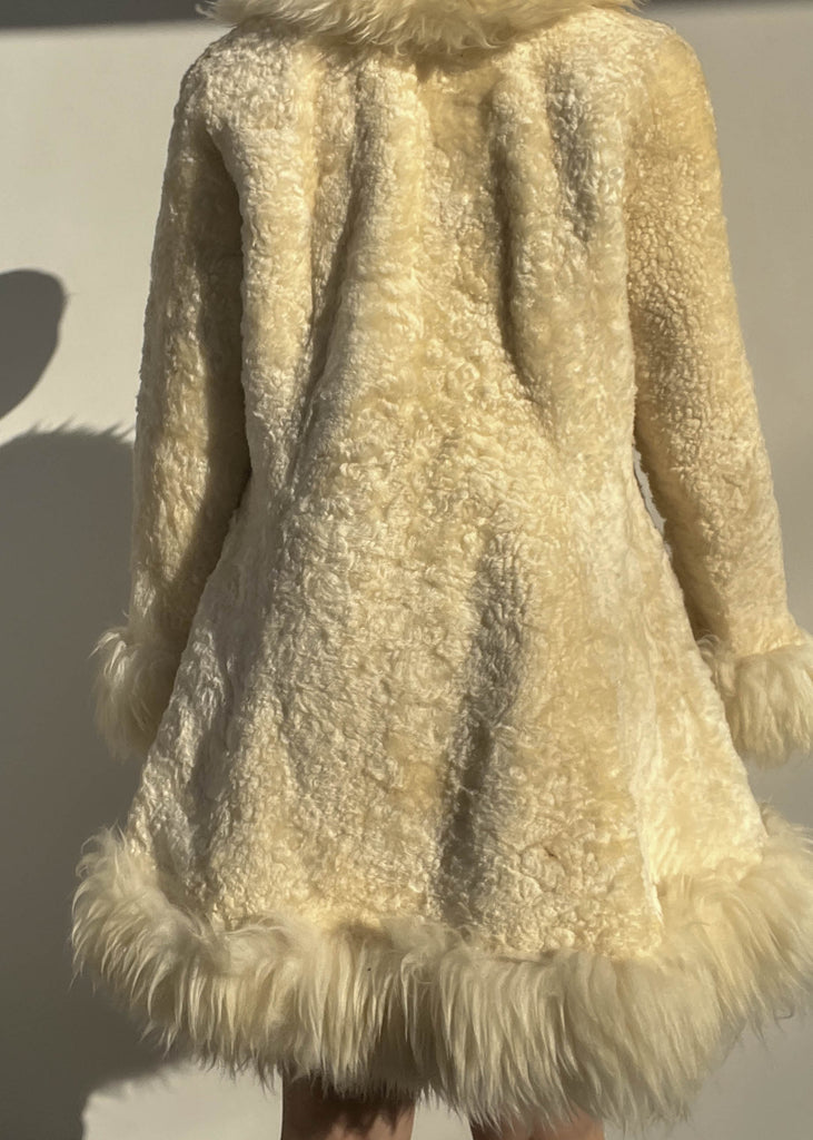 Vintage 70's golden cream fuzzy fur trim coat with hook & eye closures down the front.