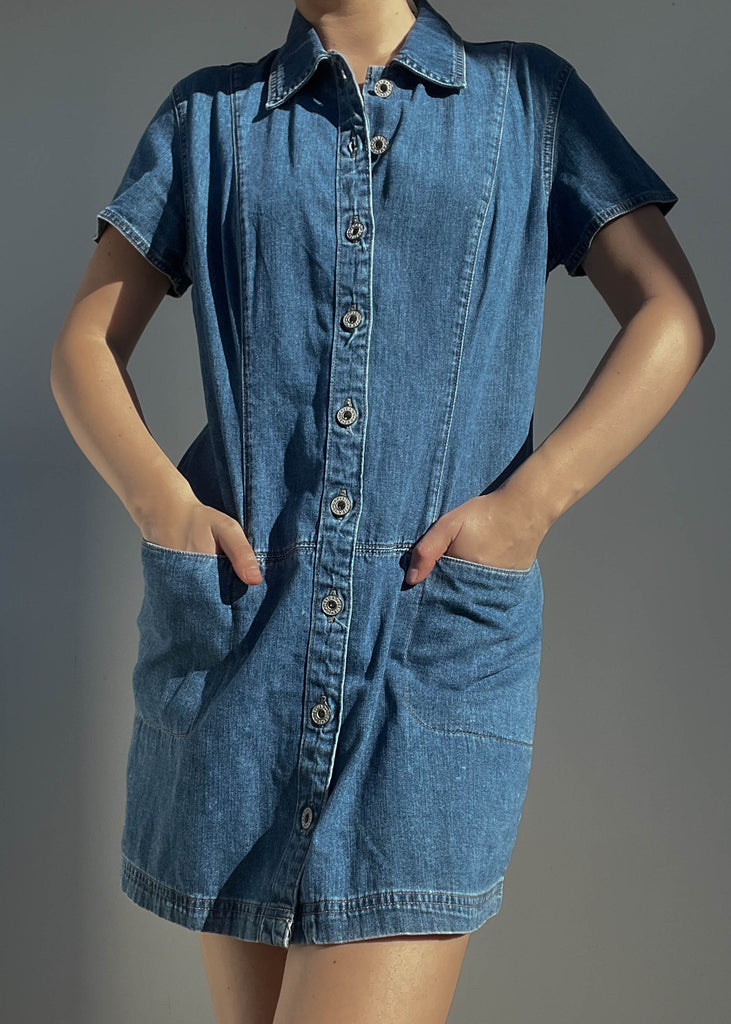 Vintage 90’s Gap dark wash denim short sleeve button down mini dress.