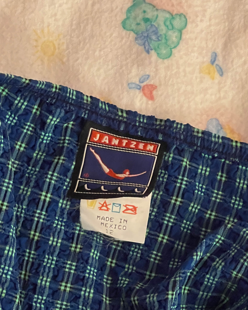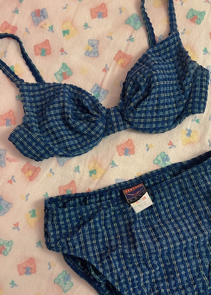 vintage early 90’s navy blue & green plaid bikini with high waisted bottoms