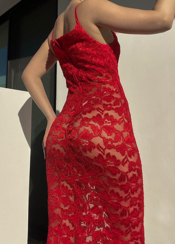 Vintage 90’s red lace maxi dress with an extra layer of solid red around the top / bust area.